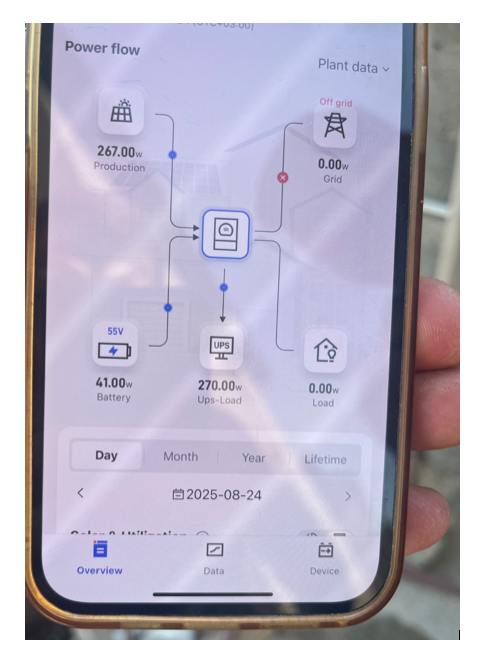 — С конца апреля полностью отключился от сетей, — говорит Магомед и в подтверждение показывает выключенный системный стабилизатор. При этом хозяин включает его, чтобы показать нам причину перехода на автономию, — 130 вольт! А солнечные панели мне дают стабильно 234 вольта, — на смартфоне через программу удаленного доступа Магомед показывает, что панели 24 августа в 14:49 вырабатывают 267 W, а инвертор дает 270 W.