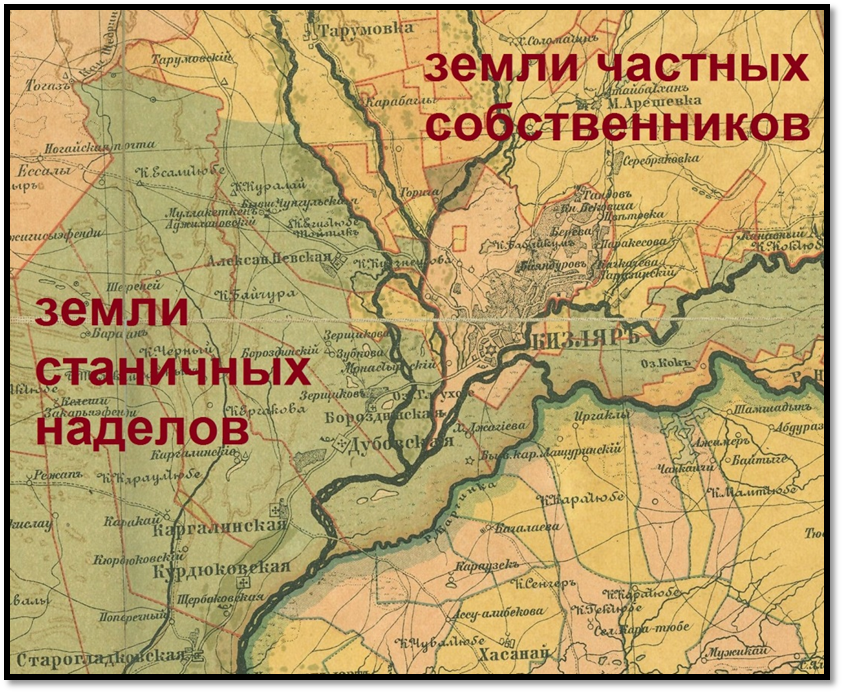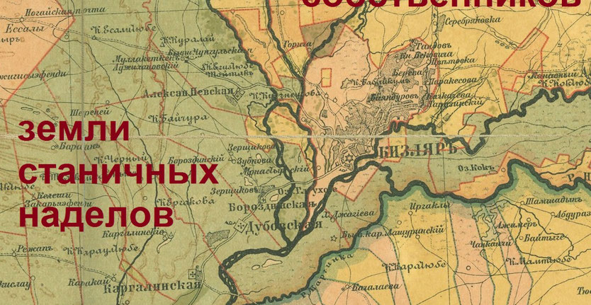Так, неизвестно, откуда Карибов взял, что «казачьи общества созданы во всех 85 регионах РФ». Далее, ссылаясь на неназванные труды неназванных ученых из «нашей академии наук» и держа в руках какие-то карточки, он заявляет, что, помимо Александрийской (о которой мы уже давали подробную справку), якобы казачьими поселениями являлись Аверьяновка, Бредихинская, Крайновка, Калиновка, Тарумовка, сам Кизляр, «ну и там еще какие-то объекты». На самом же деле, почти все это очень поздно возникшие поселения, и достаточно взять известную карту Терской области 1898 года издания Терского статистического комитета, где контрастно показаны виды землевладения, чтобы убедиться, что все перечисленные населенные пункты никогда не являлись казачьими станицами и не входили в состав земель Терского казачьего войска.