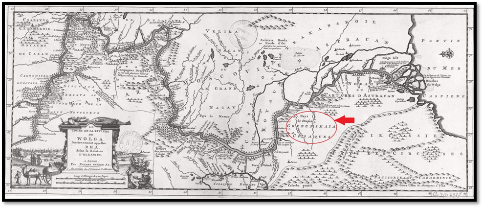 Но все, что так пространно пытался донести А. Карибов, просто меркнет по сравнению с шокирующими откровениями, зачитанными с монитора «атаманом» Б. Блиновым. Не раскрывая своих источников, он заявил, якобы казаки появились у нас «официально в 1577 г., а неофициально — даже XIII век есть данные, что казачество уже существовало на территории Дагестана — это гребенские казаки, это связано с гребнями гор, т.е. жили они в предгорьях гор, это первое упоминание о казаках, которые тут были. Иван Грозный предложил казакам в обмен на выделение земли обеспечение порохом, пулями, поддержкой, образовать казачье войско. Мы — казаки в республике Дагестан, я еще раз повторяюсь, являемся сословием-народностью, которое здесь проживает больше 400 лет». И дело тут даже не в абсолютной несостоятельности всех ранних датировок, поскольку историческая наука не оперирует категориями «официально/неофициально», а должна ссылаться на источник, который либо есть, либо его нет (ссылку на «первое упоминание» нам так и не предъявили). И даже не в абсурдности утверждения, что не владевший в 1577 г. ни одним гектаром земли на Северном Кавказе Иван Грозный мог кому-то что-то «уступить или пожаловать» на территории других государств. Поражает озвучиваемый безо всякого стеснения экспансионистский посыл, перебрасывающий казаков куда-то аж в «предгорья гор», причем в Дагестане. Хотя до недавнего времени эти притязания в казачьей литературе ограничивались лишь территориями Чечни. И это при том, что даже живший в два раза ближе по времени к рассматриваемым вопросам военный историк ген.-лейт. Н.Ф. Дубровин писал: «Указать точно местоположение первых казачьих поселений, «городков», не представляется возможным по неимению вполне достоверных документальных данных. Известно только, что после похода казанского губернатора, генерал-адмирала Апраксина, на Кубань летом 1711 г. гребенские казаки были переселены на левый берег Терека, на то место, где станицы их существуют и в настоящее время» (Дубровин Н.Ф. История войны и владычества русских на Кавказе. Том 3, Часть 1. С. 5). То есть речь может идти никак не о «более 400 годах», а едва только «300», но опять же не о территории Дагестана, поскольку Гребенской полк, расселившийся на среднем Тереке в станицах Червленная, Щедринская, Старогладковская, Новогладковская и Курдюковская, целиком располагался на территории современного Шелковского района ЧР и полностью пребывал в церковном расколе, то есть не следовал РПЦ, в отличие от Б. Блинова и его последователей, и к Дагестану ни малейшего отношения не имеют. Где же были те «гребни», на которых «гребенцы» поселились первоначально, позволяет ответить карта все того же Адама Олеария, на которой вдоль западного («горного») берега Волги четко читается «Grebenskaia cosaques». Сопоставимые по возрасту источники, позволяющие как-либо оспорить такую локализацию, — отсутствуют. Так что Б. Блинов просто-напросто занимается наглой фальсификацией истории (!), опираясь вместо подлинных источников на тенденциозную макулатуру апокрифического характера, наработанную фолк-историками за последние 100–150 лет.