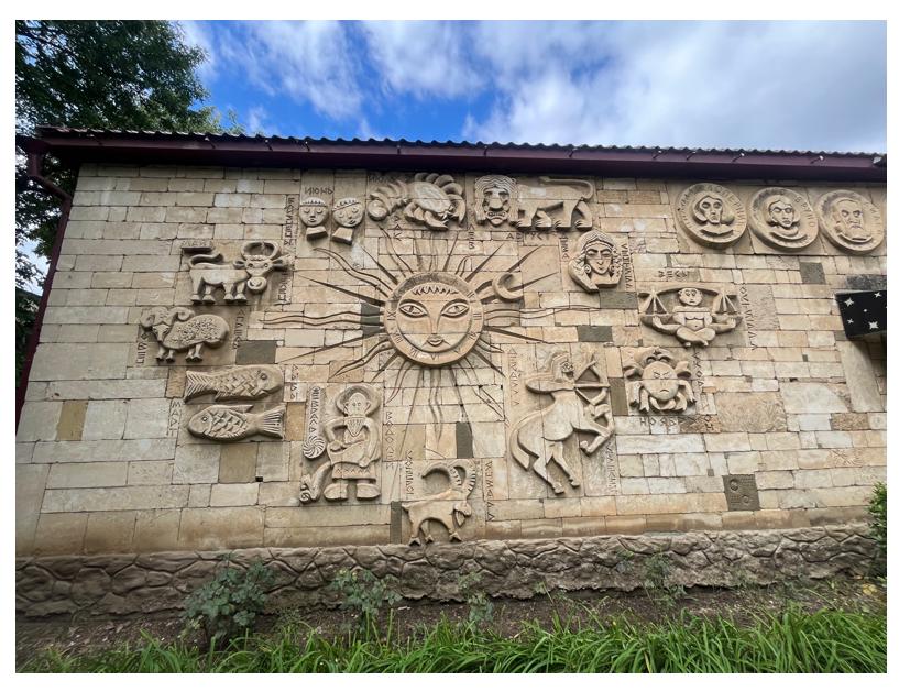 В каком городском музее посетителей усадят в саду, где расставлены каменные фигурки, по форме похожие на японские нэцкэ из слоновой кости, между деревьев со свисающими плодами айвы и инжира за стол, на котором хранительница очага расставила мясо, соки из местного сада, овощи, сушеные яблоки и инжир? Мы таких еще не встречали. За чаем поговорили с профессором о забытых символах солнца в дагестанской материальной культуре. В горских архитектурных украшениях присутствовали элементы солнца, дагестанцы использовали каменные солнечные часы.