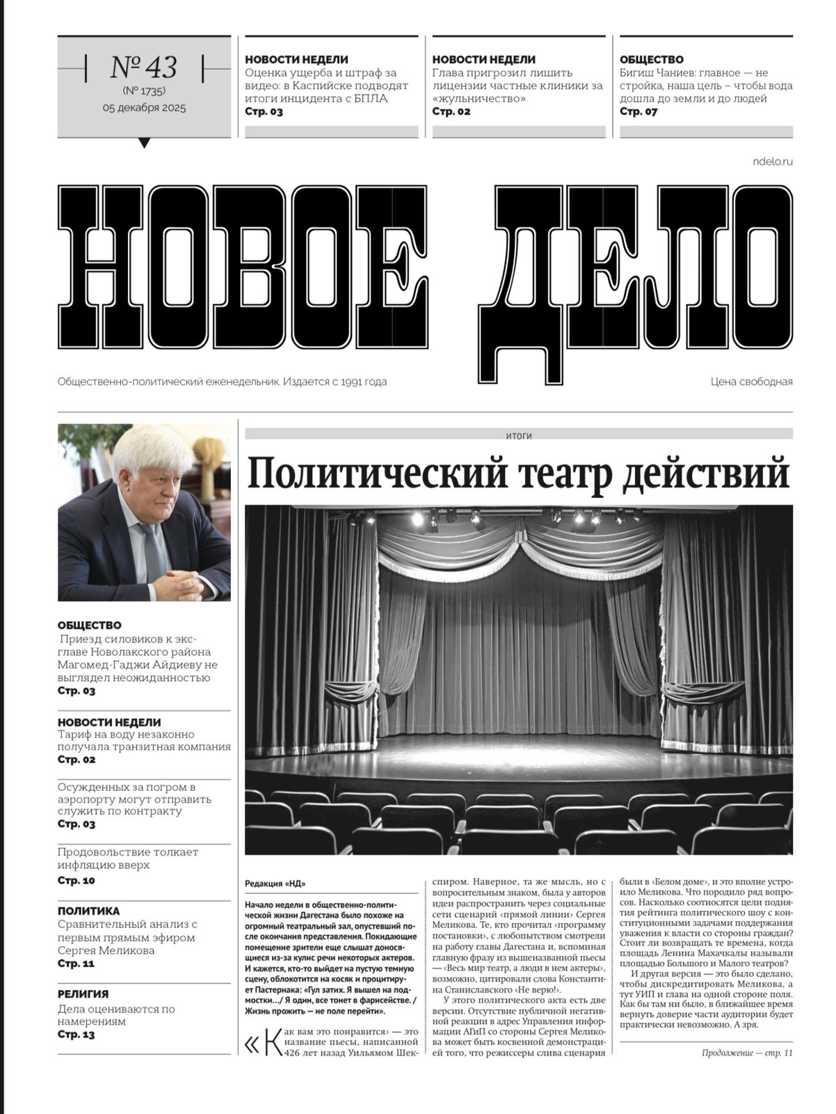 10.12.2025 18:22Начало недели в общественно-политической жизни Дагестана было похоже на огромный театральный зал, опустевший после окончания представления. Покидающие помещение зрители еще слышат доносящиеся из-за кулис речи некоторых актеров. И кажется, кто-то выйдет на пустую темную сцену, облокотится на косяк и процитирует Пастернака: «Гул затих. Я вышел на подмостки…/ Я один, все тонет в фарисействе. / Жизнь прожить — не поле перейти».