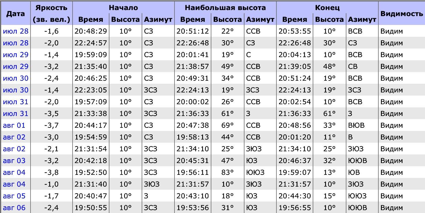 Например, вот так выглядит расписание пролётов МКС над Махачкалой с 28 июля по 7 августа.
