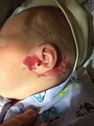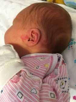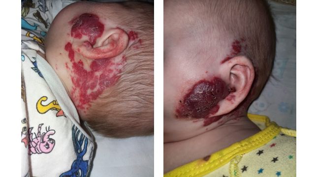 Рост гемангиомы: фото 1 — первые дни жизни, фото 2 — через 2 недели, фото 3 — через 2,5 месяца