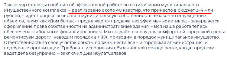 «Также мэр столицы сообщил об эффективной работе по оптимизации муниципального имущественного комплекса: – реализовано около 40 квартир, что принесло в бюджет 3–4 млн рублей;…»